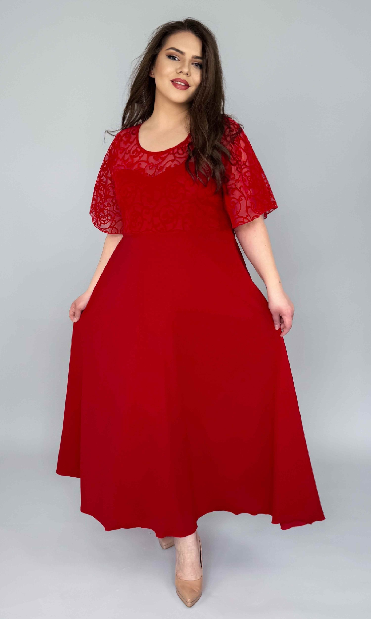 Partea superioară este realizată din dantelă delicată, atât în față cât și în spate, oferind un aspect sofisticat și elegant. Rochia este construită cu o tăietură deasupra bustului, iar zona corsetului este dublată cu crep elastic, pentru un plus de confort și susținere.