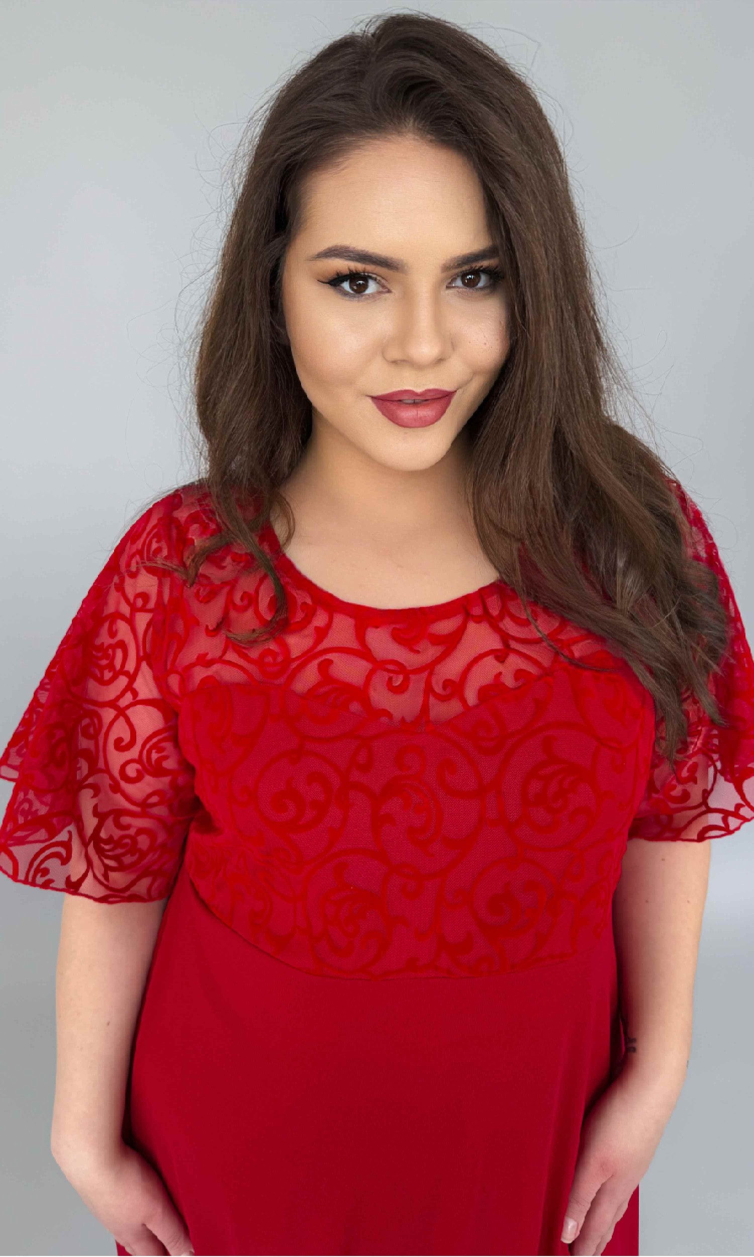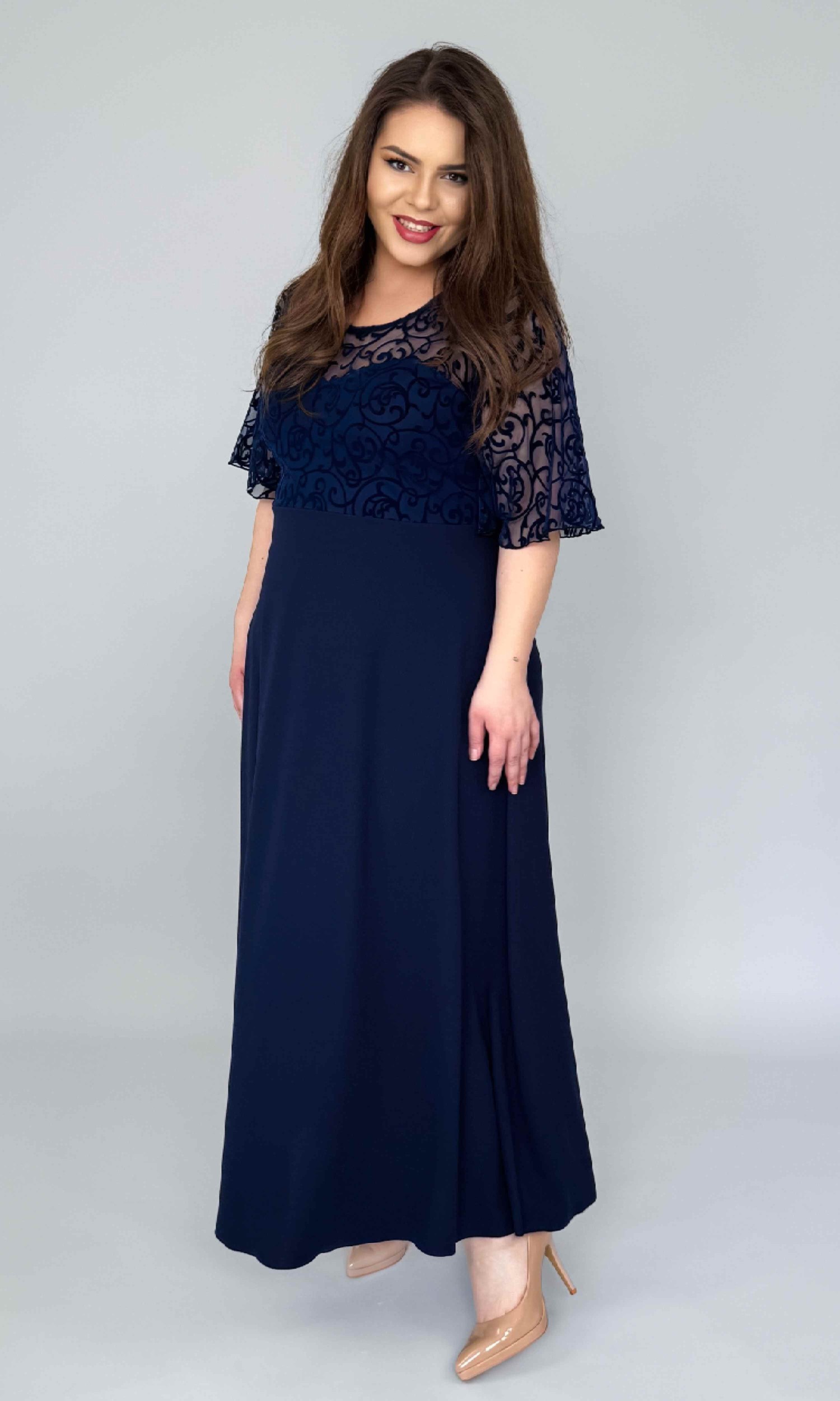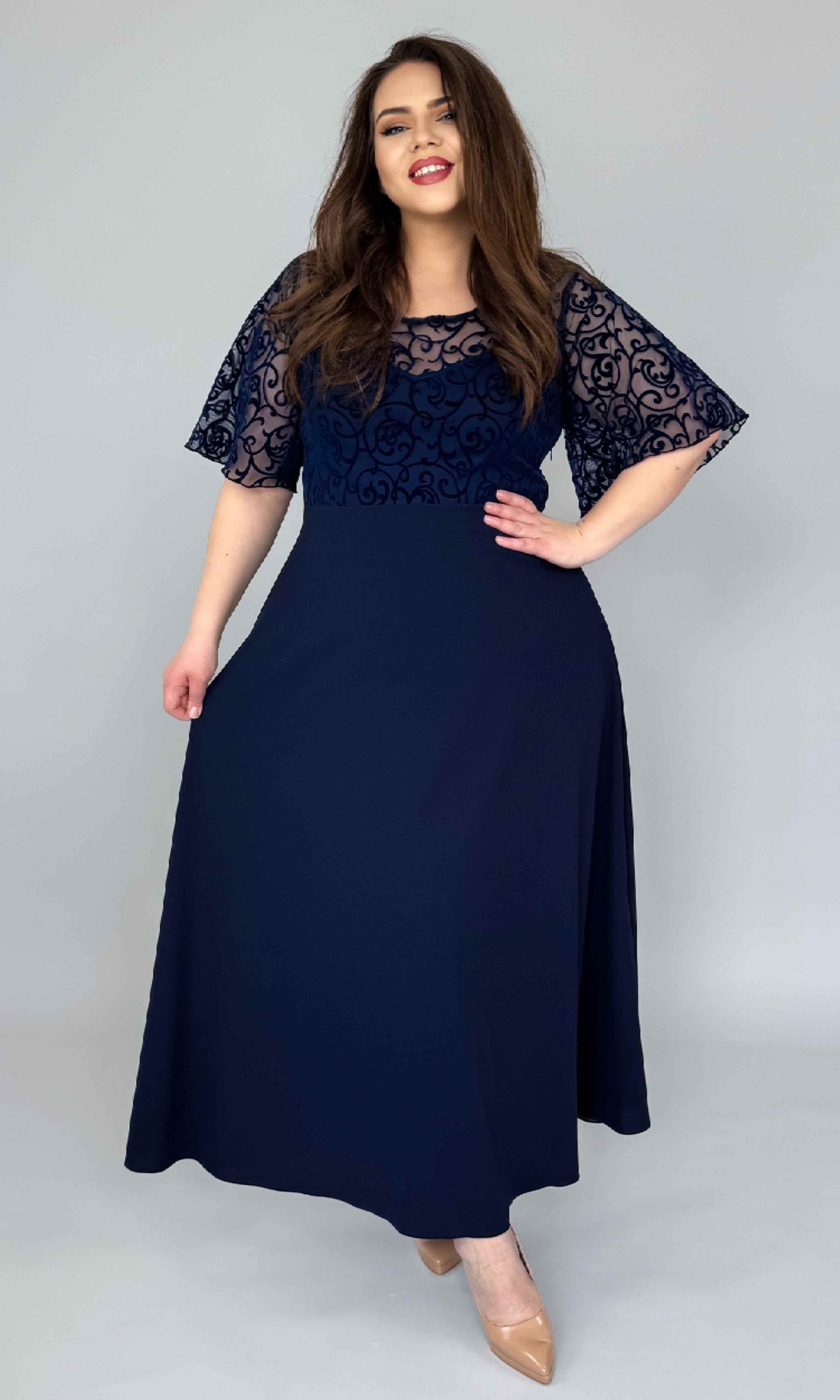 Mânecile sunt lejere, tip fluture (semiclos), din dantelă, oferind un efect fluid și foarte feminin, care avantajează orice siluetă.