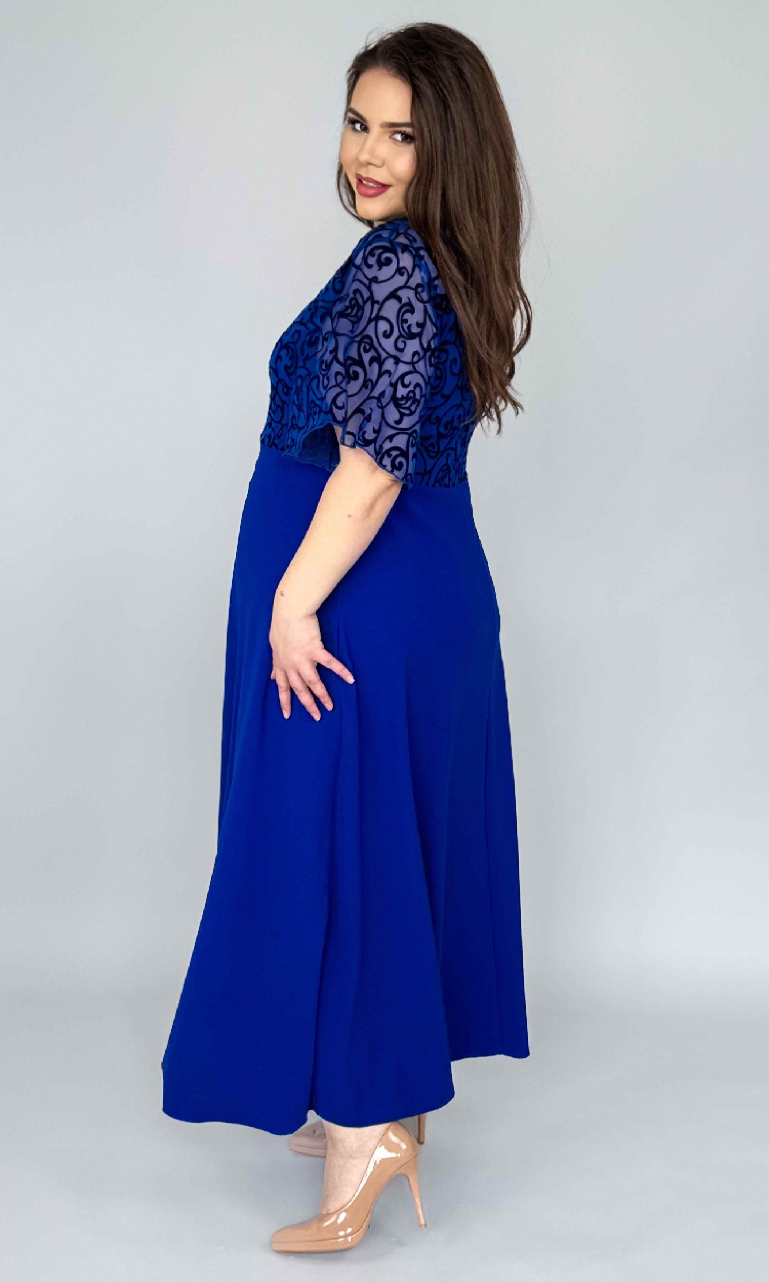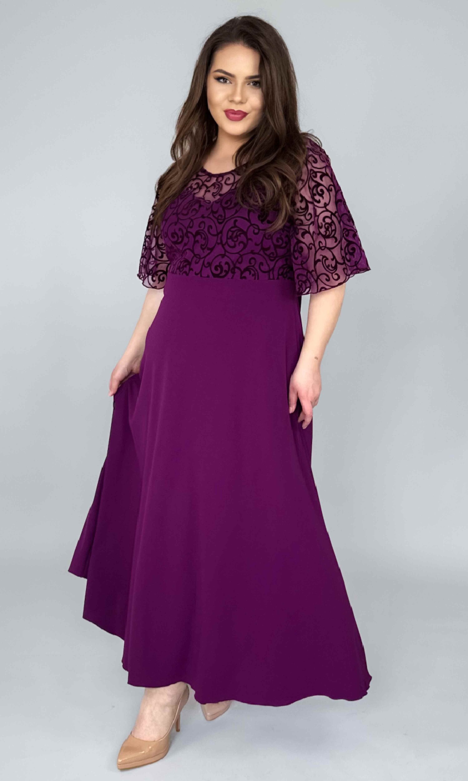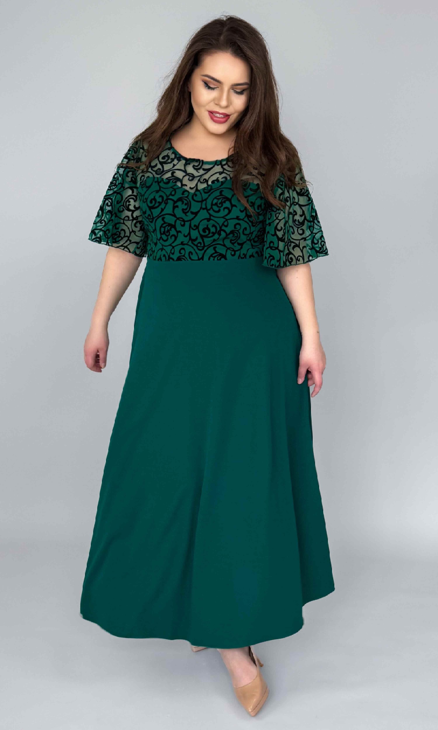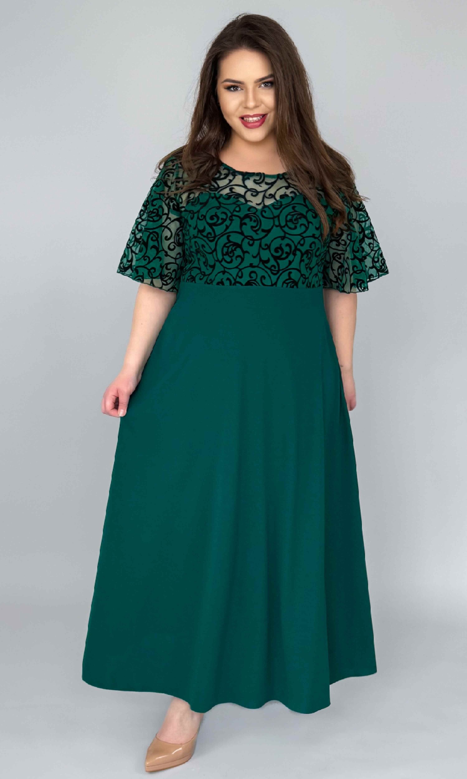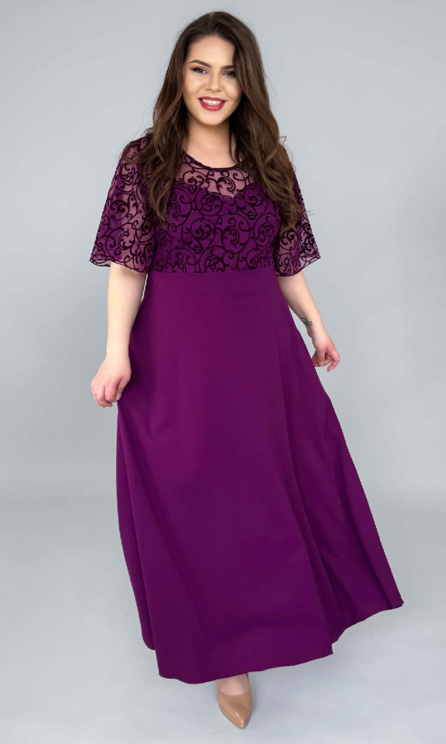 Rochia este tăiată în talie, iar partea de jos are un croi semiclos, realizat din crep elastic, care cade frumos și oferă lejeritate și libertate de mișcare. Este o rochie lungă, elegantă, dar extrem de comodă la purtare.