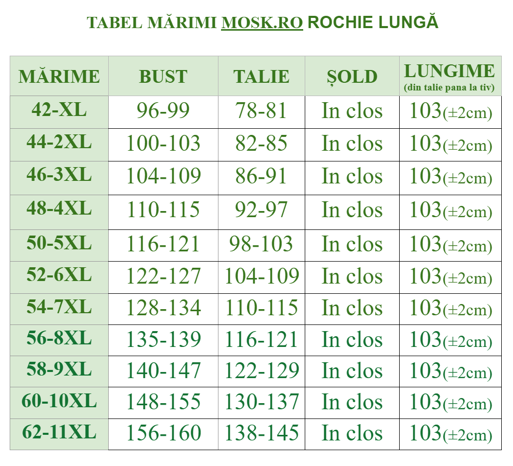 • lungime fustă: aproximativ 103 cm (măsurată din talie până la tiv)
